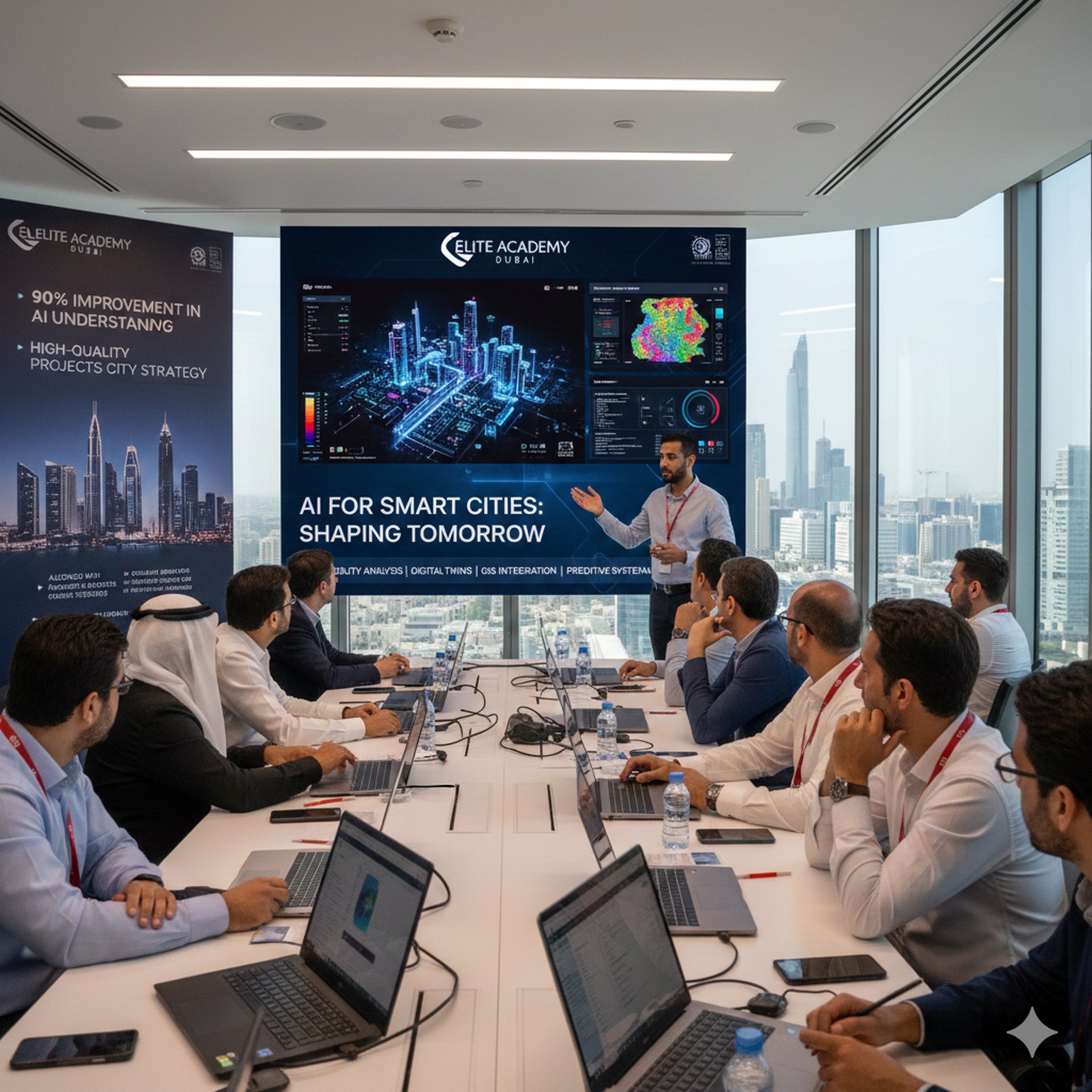 I delivered a complete 5-session training program on Artificial Intelligence for Urban Planning and Smart Cities for Elite Academy in Dubai. The program equipped urban planners, engineers, and decision-makers with practical skills in AI-based mobility analysis, environmental modelling, digital twins, GIS integration, and predictive urban systems. Through hands-on workshops using real UAE datasets, participants learned to interpret AI models, design smart-city solutions, and apply data-driven decision-making.